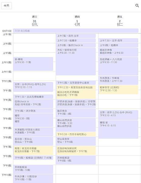 (此為兩人遊玩的實際時間,時間重複的行程代表是備案。紫色代表行程、黃色是吃東西、空白處是交通或休息時間。)